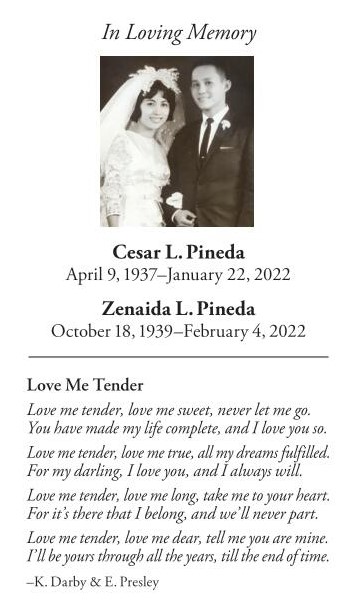 On Friday, February 4, 2022, Zenaida “Aida” L. Pineda, loving wife and mother, passed away at the age of 82 in Cape Coral, FL. Aida was born October 18, 1939 in Mayantoc, Tarlac, Republic of the Philippines (RP) to Vicente and Fe